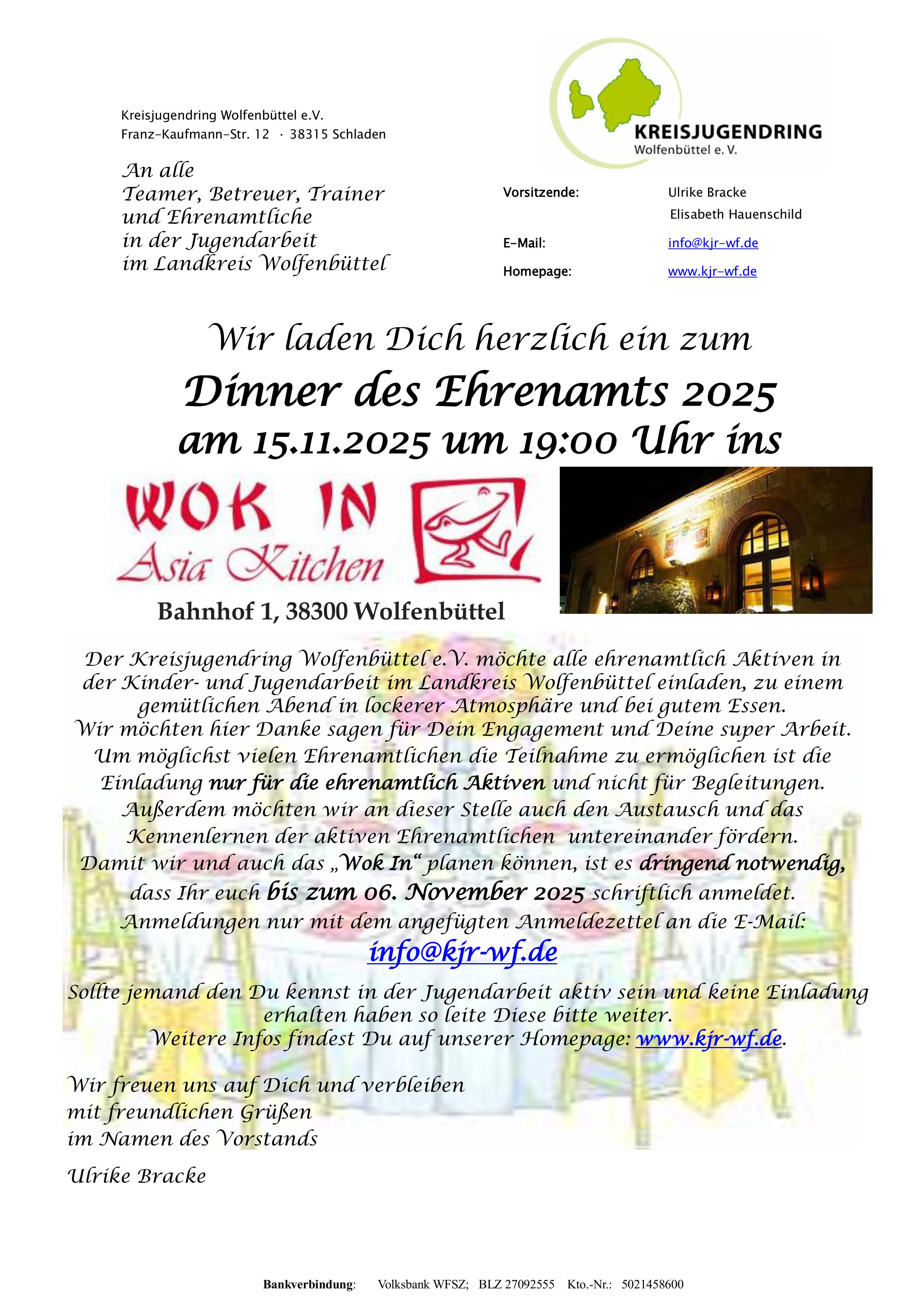 Unser Dinner des Ehrenamts findet auch dieses Jahre im WokIn Wolfenbüttel statt.